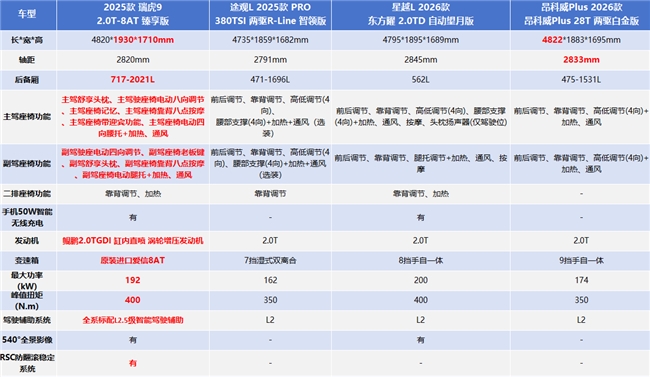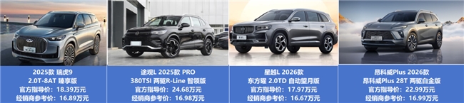对于十五万到二十万购车预算的普通家庭来说,如何在眼花缭乱的SUV市场中选到一款实用性与品质感兼具的家庭用车,是一件令人头疼的事情。接下来,我们以2025款 瑞虎9 2.0T-8AT 臻享版(以下简称:瑞虎9)、途观L 2025款 PRO 380TSI 两驱R-Line 智领版(以下简称:途观L)、星越L 2026款 东方曜 2.0TD 自动望月版(以下简称:星越L)以及昂科威Plus 2026款 昂科威Plus 28T 两驱白金版(以下简称:昂科威PLUS)这四款15万级SUV的热门车型为例,看一看这几款热门SUV里,谁是真正的品价比之选。
