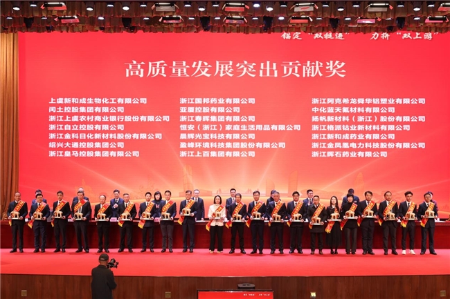 2月25日,新昌县召开高质量发展大会。公司董事长胡柏藩老师,副总裁张丽英老师参加会议,并作为获奖代表上台领奖。新和成控股集团荣获“2025年度新昌县共同富裕县域标杆贡献奖-金奖(功勋奖)”,股份公司荣获“2025年度新昌县高质量发展领航重才爱才奖”。