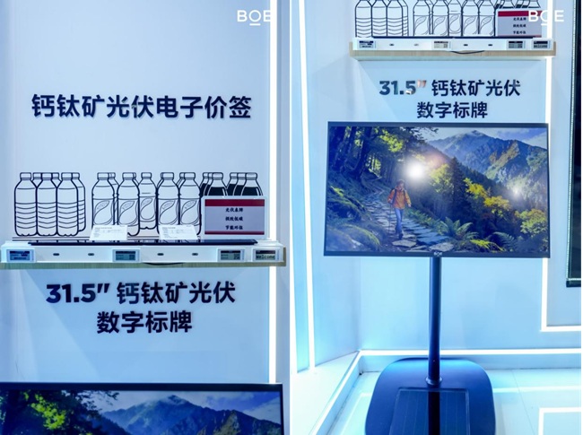 作为可持续发展战略的长期践行者,本次展会中,BOE(京东方)带来了多款创新的钙钛矿光伏技术及系列产品。钙钛矿光伏柔性大组件凭借出色的柔韧性,具备优异的抗冲击性能,有效降低隐裂与破损风险。同时,依托其弱光发电效率高、轻质化、可半透明以及尺寸可定制等技术优势,可广泛应用于消费电子、CIPV(汽车光伏一体化)、BIPV(建筑光伏一体化)、电站等多元场景。目前,该技术已在本次展出的光伏价签、电子桌牌、31.5寸数字标牌及光伏电动车等产品中实现应用。